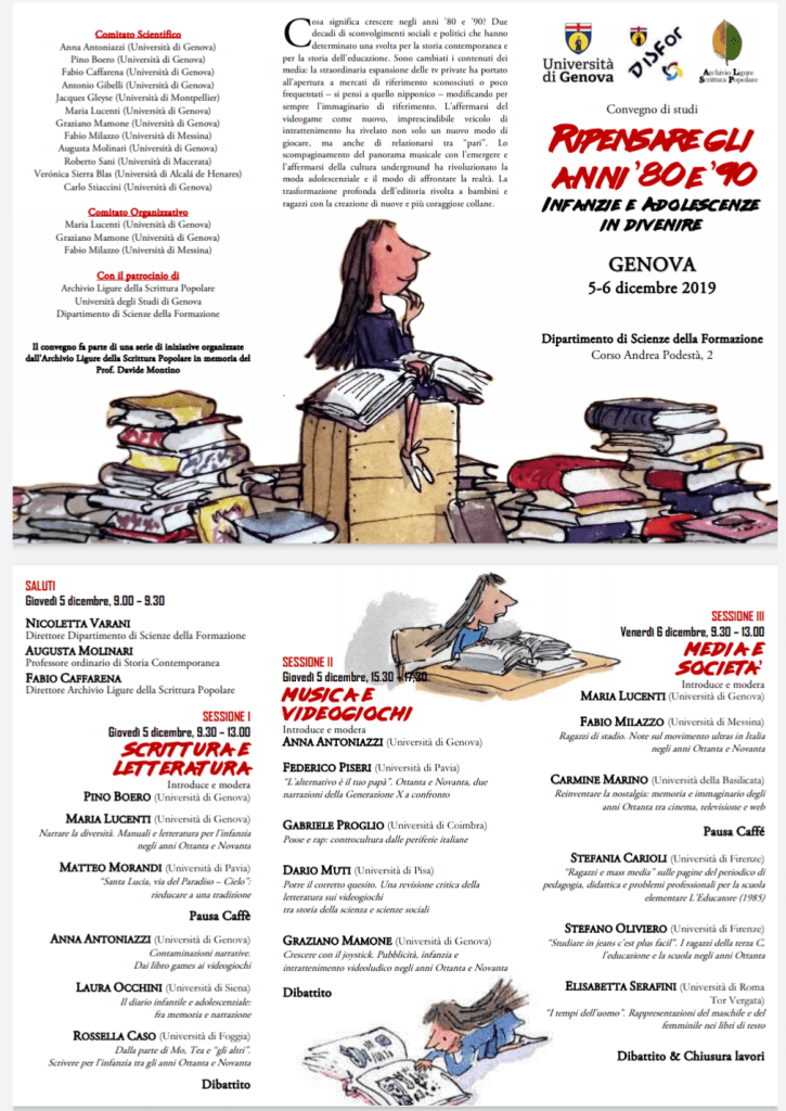 Insieme con Maria Lucenti e Graziano Mamone sono tra gli organizzatori del convegno Ripensare gli anni ’80 e ’90. Infanzie e adolescenze in divenire. Nelle tre sessioni si discuterà di scrittura e letteratura, musica e videogiochi, media e società.