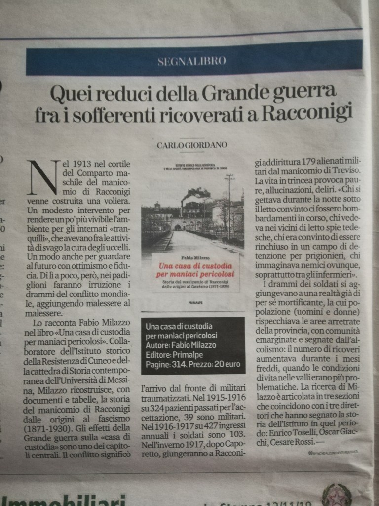 Pubblicata su La Stampa, del 13 Novembre 2019, una recensione a Una casa di custodia per maniaci pericolosi. Storia del manicomio di Racconigi dalle origini al fascismo 1871-1930, a cura di Carlo Giordano.