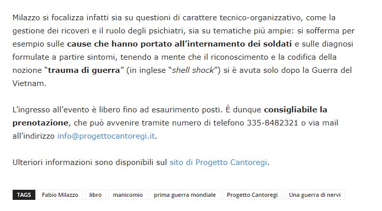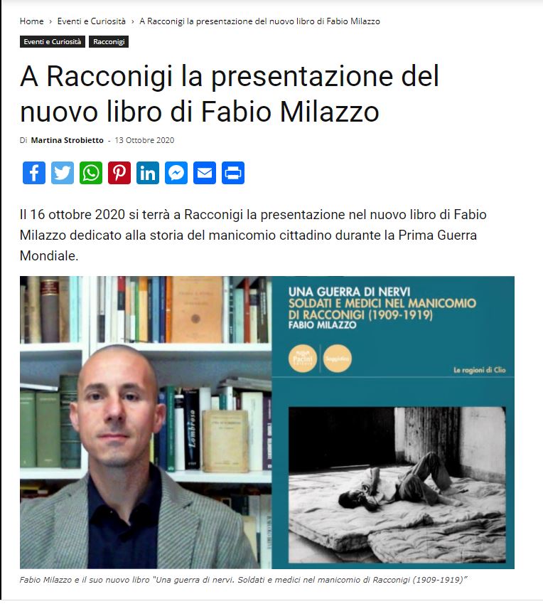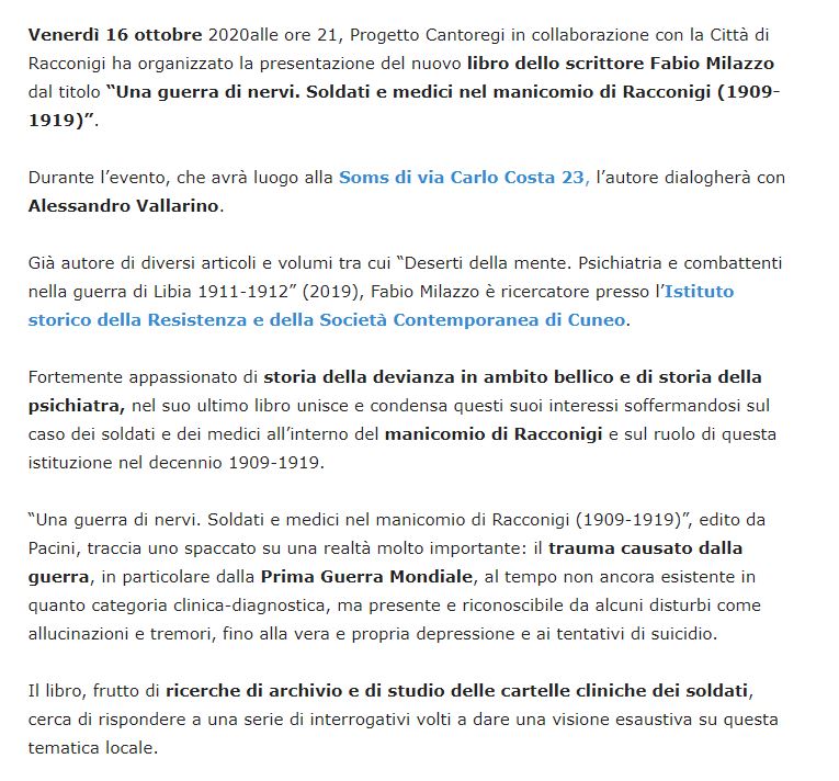 Pubblicato su “Il Carmagnolese” del 13 Ottobre 2020, a firma di Martina Strobietto un articolo su Una guerra di nervi. Soldati e medici nel manicomio di Racconigi (1909-1919).
