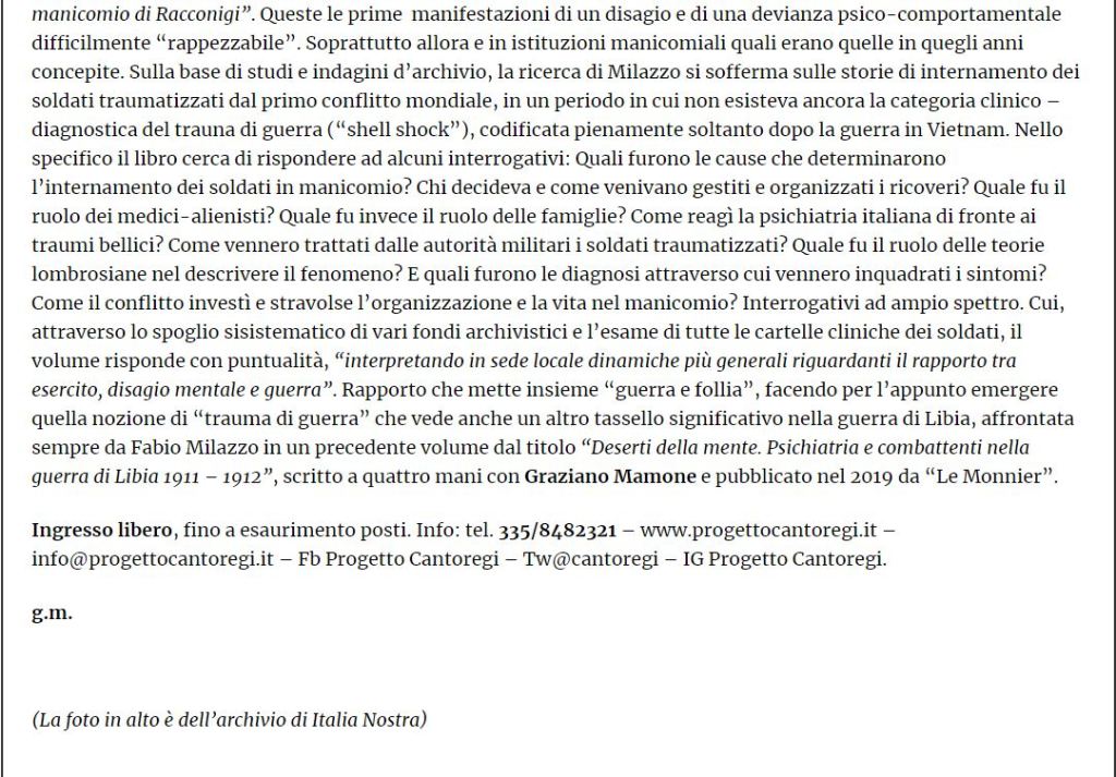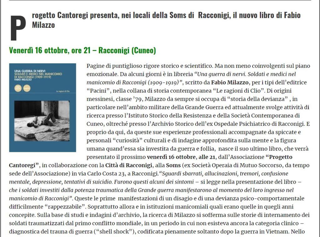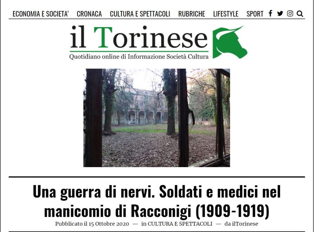 -Pubblicato su “il Torinese” del 15 Ottobre 2020 un articolo su Una guerra di nervi. Soldati e medici nel manicomio di Racconigi (1909-1919) [Pacini ed., 2020)