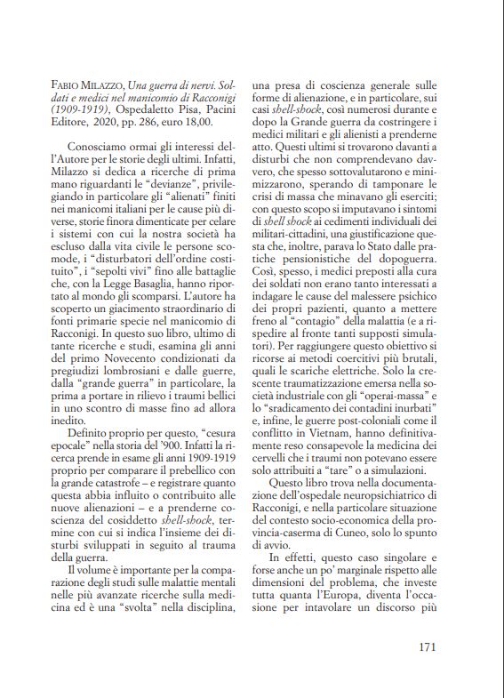 Su “Il Presente e la Storia“, n.98, 2/2020, è stata pubblicata una recensione a Una guerra di nervi. Soldati e medici nel manicomio di Racconigi 1909-1919, a cura di Michele Calandri.