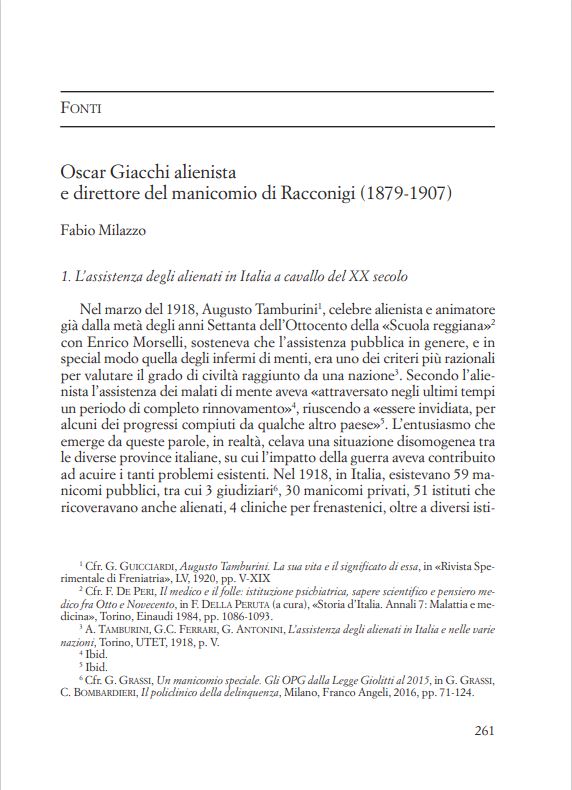 Sul numero 100 de Il Presente la Storia, 2/2021, è presente un mio contributo dal titolo “Oscar Giacchi alienista e direttore del manicomio di Racconigi (1897-1907)”.