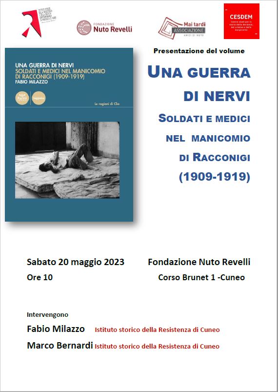 Sabato 20 maggio 2023, presso la Fondazione Nuto Revelli, Corso Brunet 1 -Cuneo, alle ore 10, si terrà la presentazione del libro “Una guerra di nervi. Soldati e medici nel manicomio di Racconigi 1909-1919” (Pacini 2020).