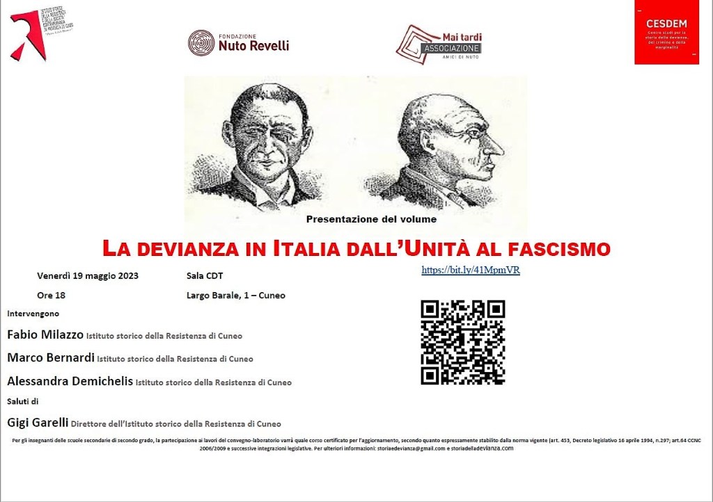 Venerdì 19 maggio 2023 , presso la Sala CDT, Largo Barale, 1 – Cuneo, alle ore 18, si terrà la presentazione del libro “La devianza in Italia dall’Unità al fascismo. Discorsi e rappresentazioni” ( Biblion 2022), frutto del progetto di ricerca del CESDEM (Centro Studi per la Storia della Devianza, del Crimine e della Marginalità) promosso dall’Istituto Storico della Resistenza e della Società Contemporanea di Cuneo.